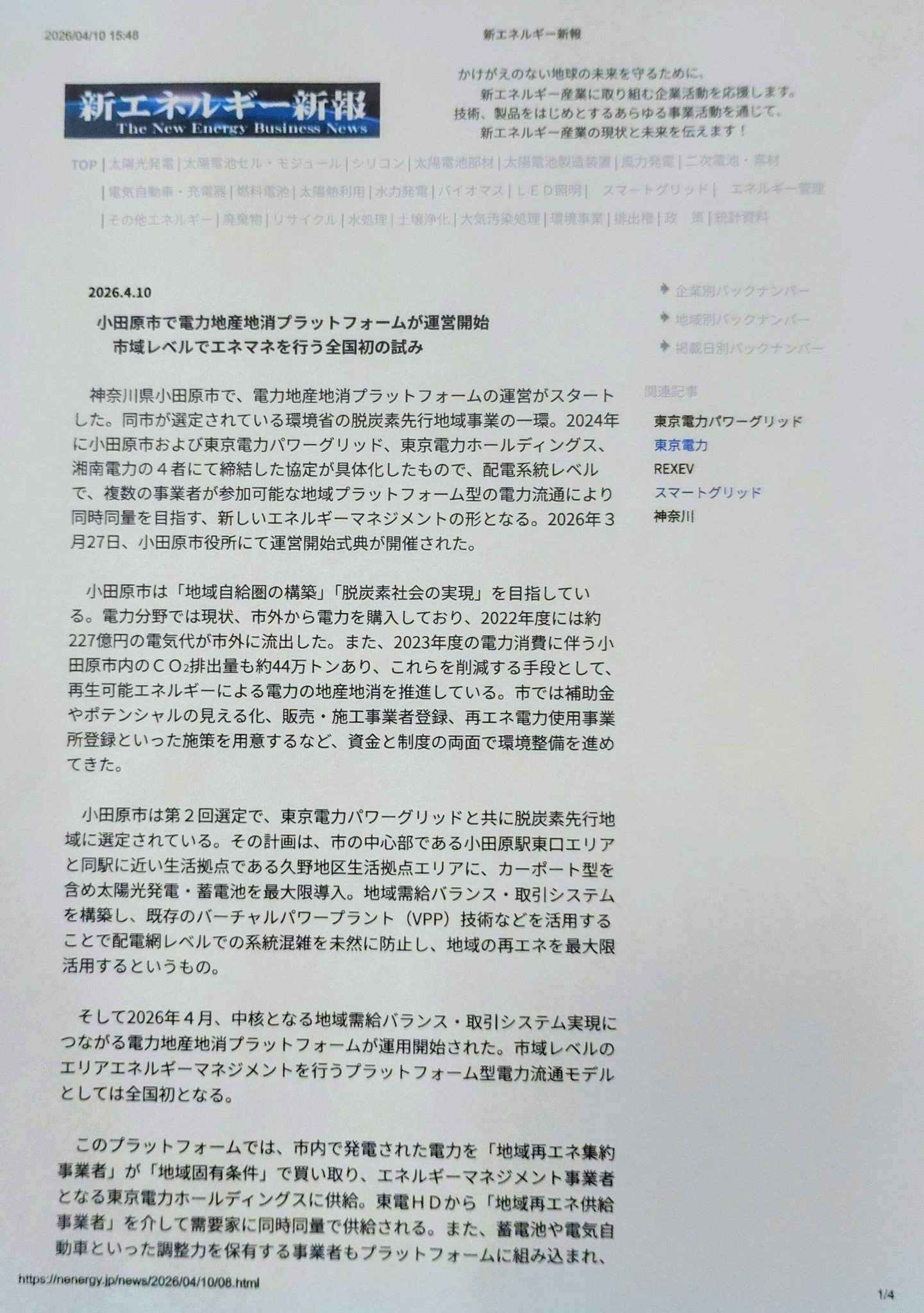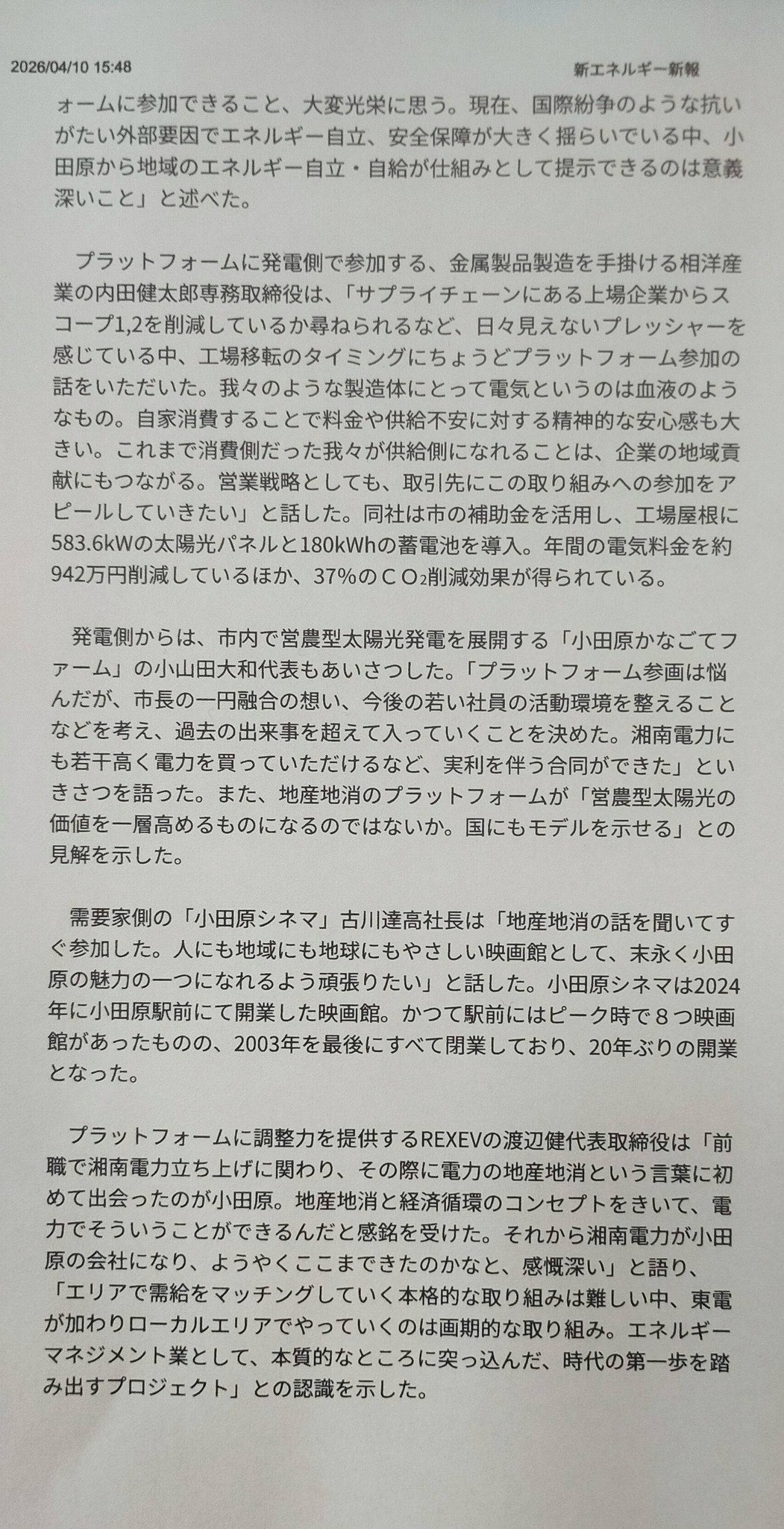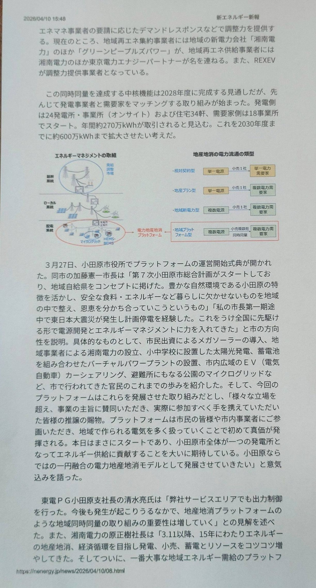 3/27に記者会見した小田原市電力地産地消プラットフォーム運営開始の記事がかなり細かく掲載されました。私のコメントもきちんと要旨を的確に掲載してもらっています。